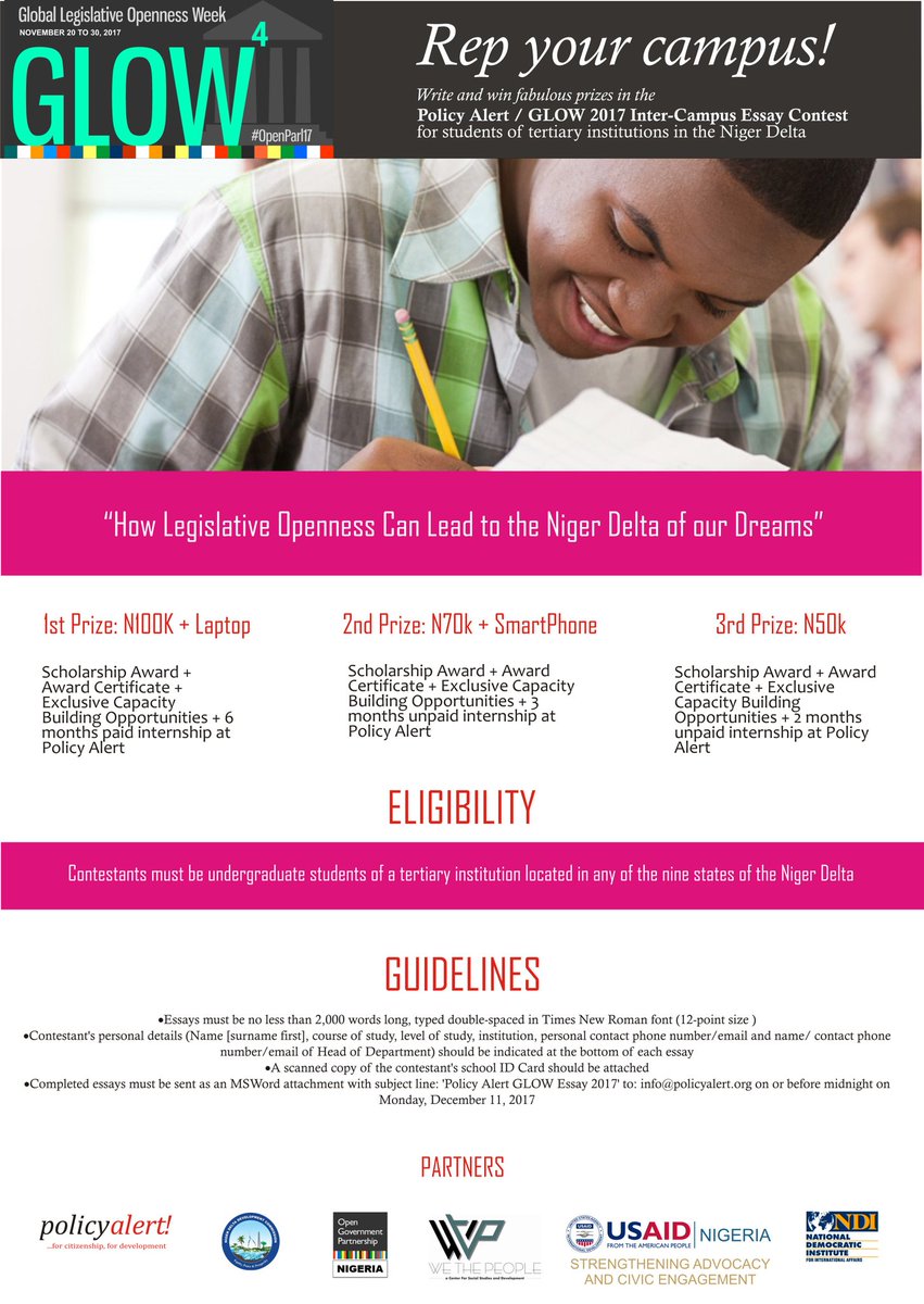 The GLOW 2017 Essay Contest on the theme ‘How legislative openness can lead to the Niger Delta of our dreams” for students of tertiary institutions in the Niger Delta region seeks to generate ideas, trigger debate and inspire fresh thinking on legislative openness in the Niger Delta and Nigeria. It was launched by Policy Alert on Thursday, November 30, 2017, as part of activities for the Global Legislative Openness Week (GLOW2017) marked around the world from November 20-30, 2017.