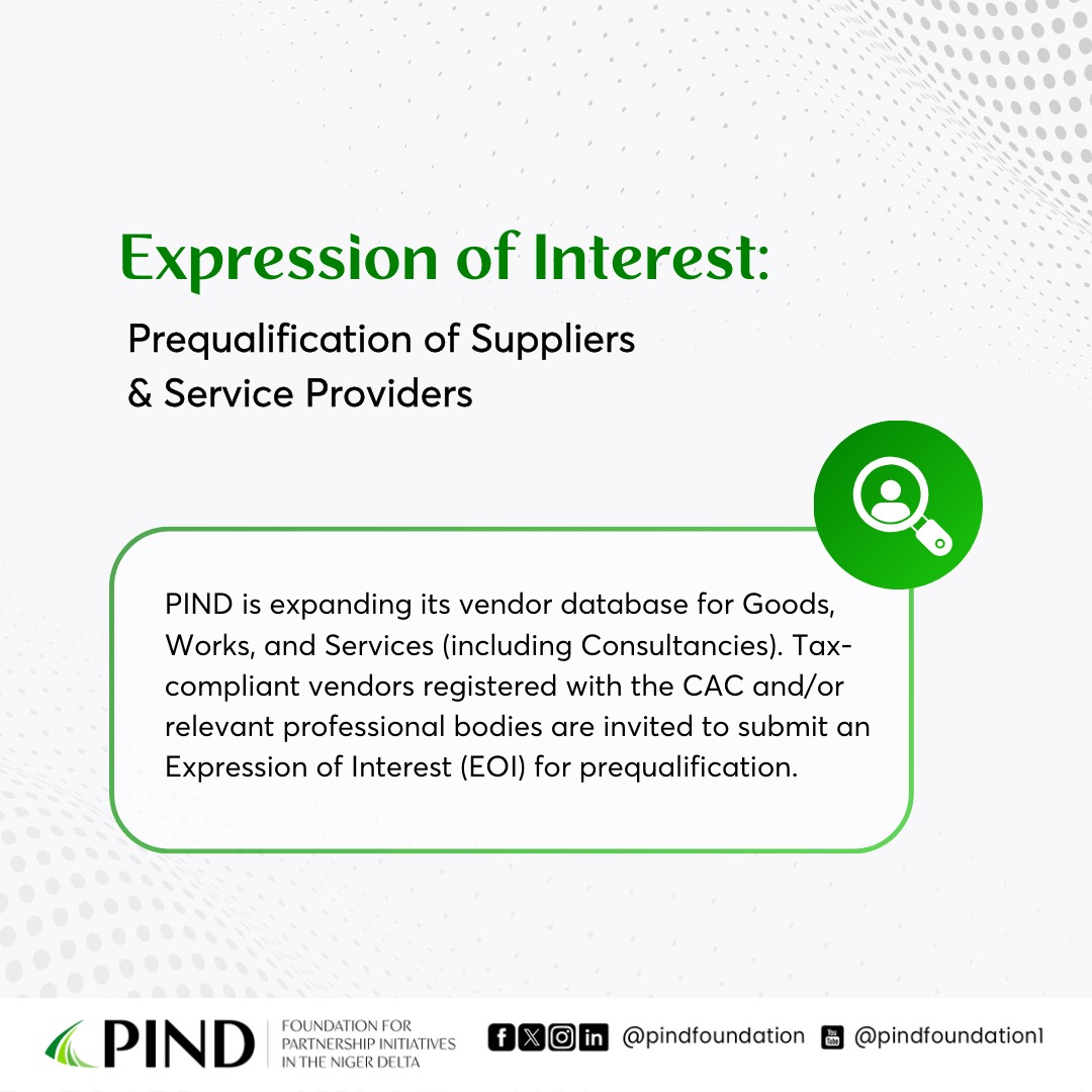 The Foundation for Partnership Initiatives in the Niger Delta (PIND) invites qualified and reputable suppliers, contractors, and service providers to submit Expressions of Interest for prequalification in 2025.